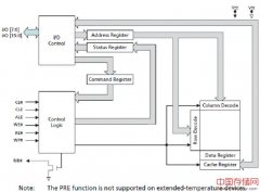 Samsung的 K9F1208U0B,数据存储容量为64MB ,采用块页式存储管理。8 个I/O引脚充当数据、地址、命令的复用端口。
