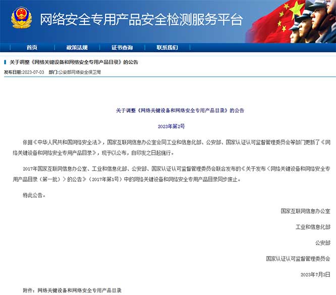 2023年7月3日,依据《中华人民共和国网络安全法》,国家互联网信息办公室会同工业和信息化部、公安部、国家认证认可监督管理委员会等部门更新了《网络关键设备和网络安全专用产品目录》,自印发之日起施行。