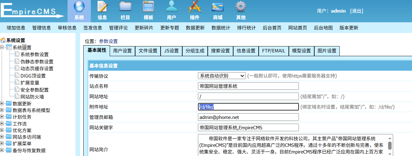 需要注意的是,如果在 系统参数设置-文件设置-附件存放目录 这项中,选择的是“栏目目录”则需要手动创建栏目目录文件夹,选择的是 /d/file/p目录 项也需要手动创建 p 文件夹,因为测试时发现程序不会自动生成文件夹,不手动创建会导致保存失败。