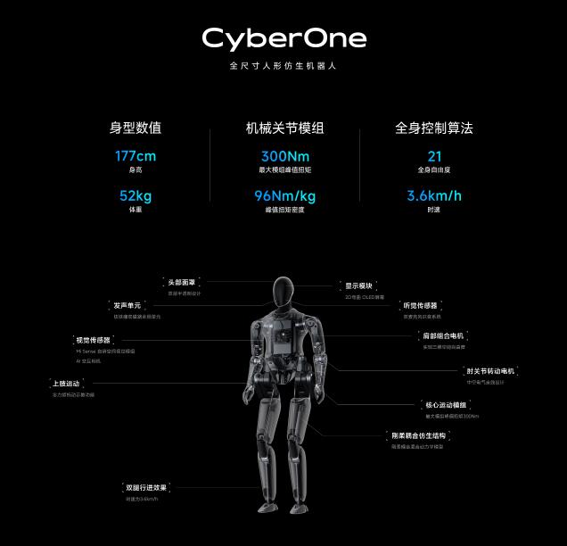 小米首款全尺寸人形仿生机器人CyberOne看点不少,内部昵称“铁大”,身高177厘米,体重52公斤,可对真实世界三维虛拟重建(自研Mi-Sense深度视觉模组,结合AI算法,提供完整的三维空间感知能力,看得到也看得懂),“小脑”发达、可实现双足运动姿态平衡,四肢强健、动力峰值扭矩300Nm等。