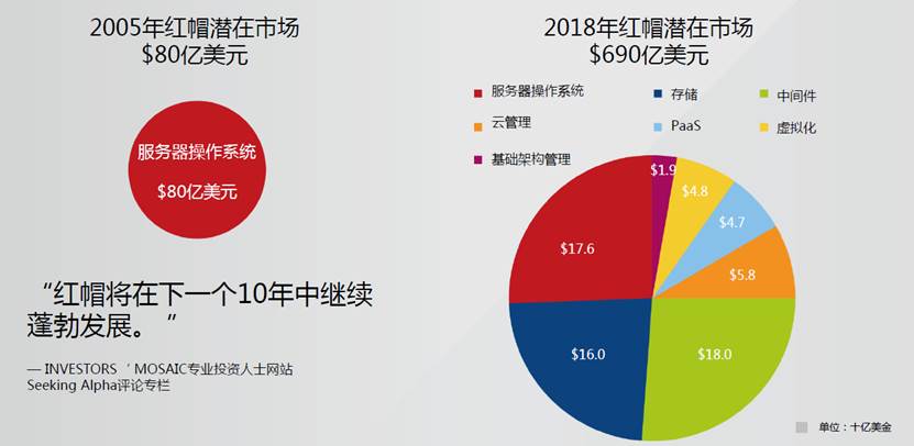 2005年,红帽的主要业务就是Linux操作系统,当时服务器操作系统的市场空间大约是80亿美金,这也是红帽的“天花板”。经过十余年发展,红帽已经进入到中间件、基础架构管理、PaaS、存储、虚拟化、云管理等多个领域,到2018年,红帽的潜在市场已经高达690亿美金。