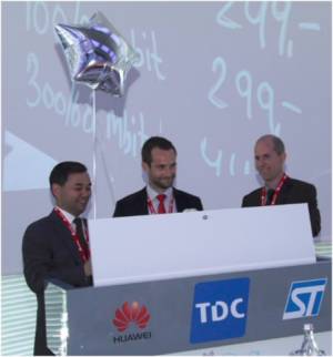在德国科隆举行的ANGACOM有线电视和宽带展览会上,华为与丹麦第一大综合运营商TDC联合宣布,近日合作完成了业界首个基于最新DOCSIS 3.1(Data Over Cable Service Interface Specification, 有线数据传输业务接口规范)标准的外场测试,终端用户的实测下行速率超过了840Mbit/s。