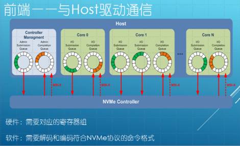 前端提供访问接口和协议,跟主机驱动通信,利用标准格式输配到系统里面,接收主机端发过来的指令,即完成、实现对应的SAS/SATA target协议端或者NVMe协议端,获取Host发出的IO指令并解码和生成内部私有数据结构等待执行。如果遵从NVMe标准,包括提交命令的方法、完成命令的处理方法等都定好了,包括各种队列、队列深度,Queue Pair的总体数量最大可以达到64K个,队列深度也可达64K个,所以,系统里同时可能存在64K×64K IO排着,但是目前的系统是用不到这么多Queue的,因为底下的介质速度还不足以支撑。