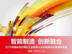 由中国传动网、《伺服与运动控制》及中国机器人网共同发起的2016中国运动控制工业机器人企业高峰论坛暨颁奖盛典即将于1月15日在深圳正式拉开帷幕。今年的运动控制工业机器人产业盛会有哪些意想不到的惊喜?在智能制造、互联网+及《中国制造2025》新背景下,高...
