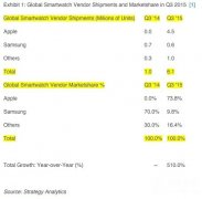 StrategyAnalytics估计2015年第三季度AppleWatch出货量为450万件,占据了约74%的市场份额。AppleWatch的地域覆盖面也在扩大,目前已遍及全球30多个国家。...