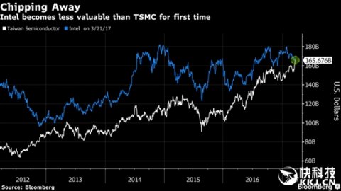 Intel市值下滑到1650亿美元左右,台积电得益于移动市场发展的良好势头,股价一路走高,整体市值历史上首次超越Intel。...
