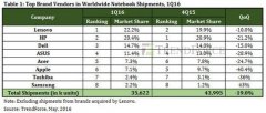 2016年一季度主流笔记本厂商销量均大跌 苹果最惨 在几大主流笔记本电脑制造商中,苹果的业绩最差,它的笔记本电脑销量同比下跌了40%,排名从第五名下滑到了第六名。... 苹果笔记本 MacBook2016-05-13