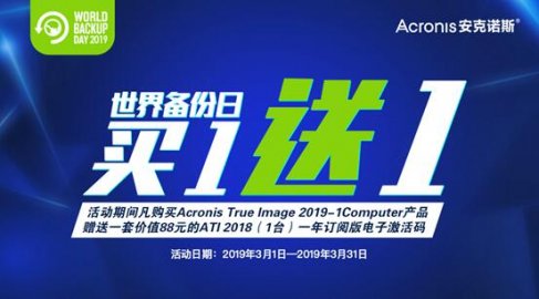 3月1日至3月31日期间,凡购买Acronis True Image 2019-1Computer产品,均可获得一套Acronis True Image 2018-1Computer一年订阅版激活码。...