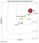 Nutanix和Simplivity在IDC MarketScape:2014年全球超融合系统供应商评估中处于领先地位,评估报告以平面图表呈现,横纵坐标分别为策略和能力。...